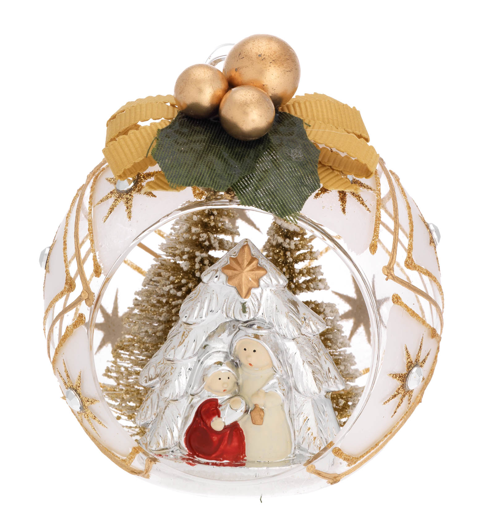 Hand-decorated glass sphere nativity scene 8cm in diameter, with gift box.