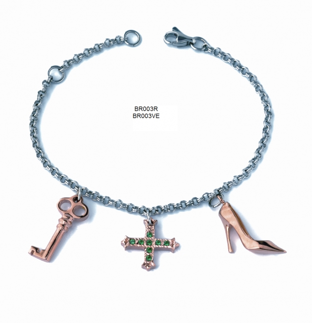Chain bracelet with polished steel with three bronze pendants of which the central (cross) with natural stones pink cm long. 21 can be reduced to cm. 17.5, with warranty and case.